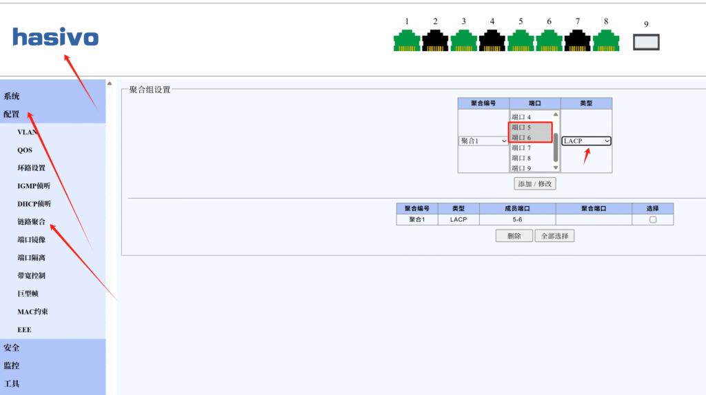 管理web界面 配置 链路聚合 将蜗牛星际两根网线链接的端口 按照图示组成LACP汇聚