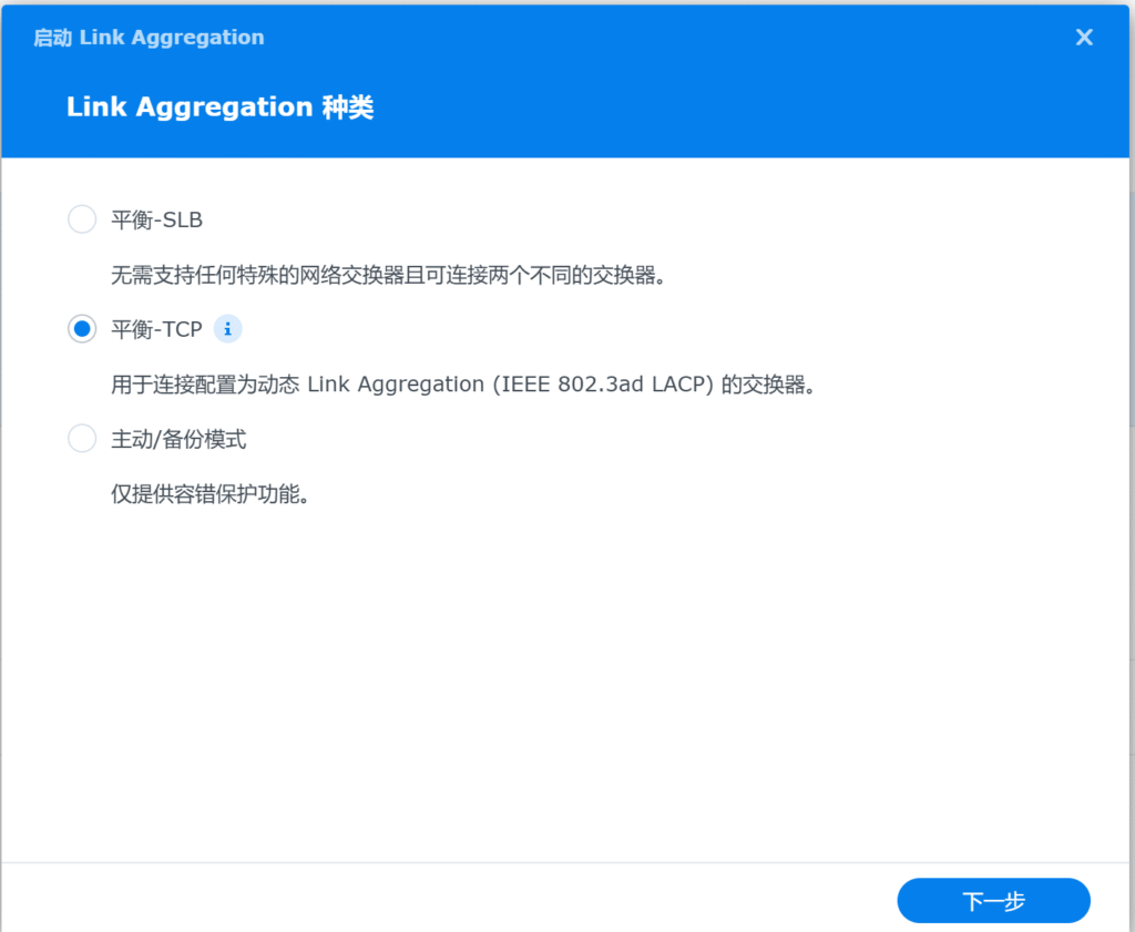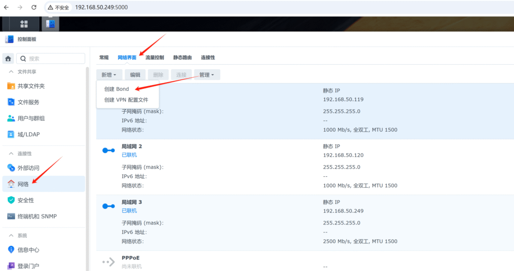 设置全新的IP地址–注意 交换机没有做LACP链路汇聚的情况下 群晖设置后会断网。设置的IP不要和网卡1、网卡2 IP地址重复。